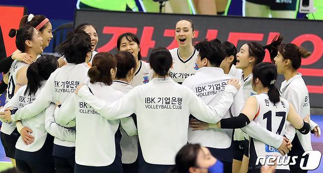 (수원=뉴스1) 이재명 기자 = 12일 오후 경기도 수원시 장안구 수원실내체육관에서 열린 프로배구 '2020-2021 도드람 V-리그' 여자부 현대건설과 기업은행의 경기에서 세트스코어 3대2로 승리를 거둔 기업은행 선수들이 기뻐하고 있다. 2021.1.12/뉴스1