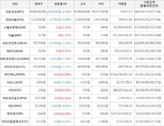 현재 암호화폐 거래소 "업비트"에 따르면 가상화폐 대장 격인 비트코인의 시세는 전일 대비 -1,094,000원(-2.73%) 하락한 39,006,000원에 거래되고 있다.