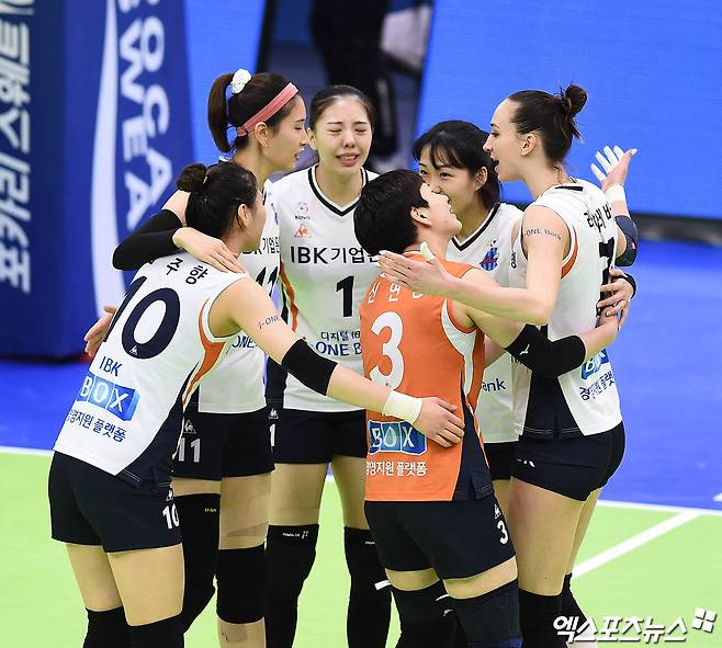 경기 종료 후 기업은행 선수들이 승리의 기쁨으 나누고 있다.