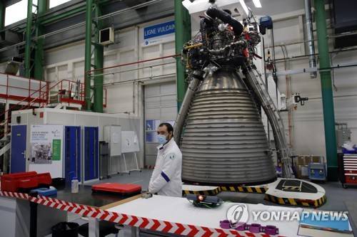 epa08932861 A worker of Ariane Group stands in front of a Ariane 6 rocket's Vulcain 2.1 engine, prior to the visit of French President Emmanuel Macron, in Vernon, western France, 12 January 2021. EPA/CHRISTOPHE ENA / POOL MAXPPP OUT