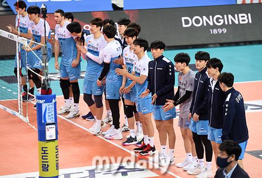 [마이데일리 = 인천 김성진 기자] 우리카드 선수들이 12일 오후 인천 계양체육관에서 진행된 '도드람 2020-2021 V리그' 남자부 대한항공과 우리카드의 경기에서 세트스코어 3-2(18-25, 25-21, 28-26, 24-26, 18-16)로 승리한 후 기뻐하고 있다.- ⓒ마이데일리(www.mydaily.co.kr). 무단전재&재배포 금지 -