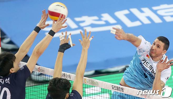(서울=뉴스1) = 12일 인천 계양체육관에서 열린 프로배구 도드람 2020-2021 V리그 남자부 우리카드와 대한항공의 경기에서 우리카드 나경복이 공격하고 있다.(우리카드 배구단 제공) 2021.1.12/뉴스1