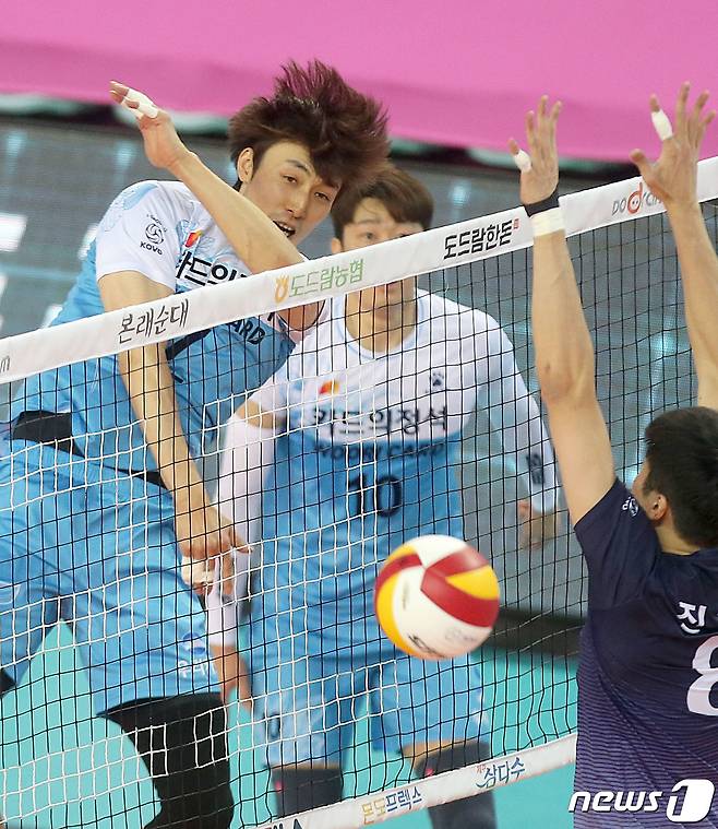 (서울=뉴스1) = 12일 인천 계양체육관에서 열린 프로배구 도드람 2020-2021 V리그 남자부 우리카드와 대한항공의 경기에서 우리카드 하현용이 공격하고 있다.(우리카드 배구단 제공) 2021.1.12/뉴스1