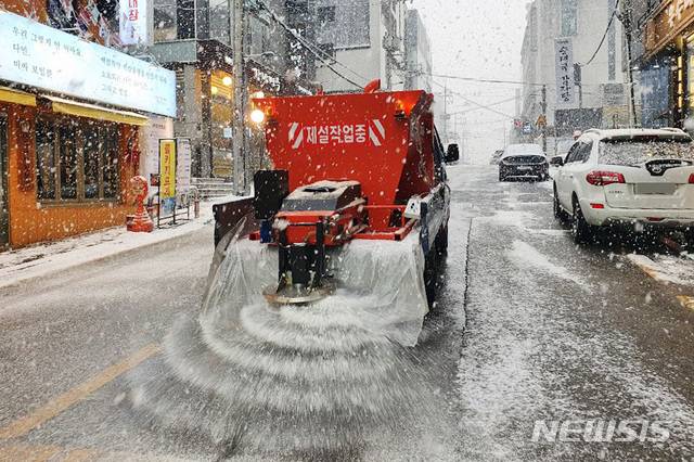 [서울=뉴시스]김병문 기자 = 수도권과 충남 등에 대설주의보가 발효된 12일 오후 서울 강남구 일대에서 강남구 직원들이 적설과 도로 결빙을 예방하기 위해 제설제 살포하고 있다. (사진=강남구 제공) 2021.01.12. photo@newsis.com