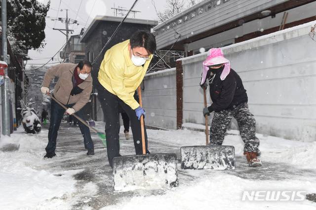 [서울=뉴시스]김병문 기자 = 오승록 노원구청장이 12일 오후 서울 노원구 월계1동에서 제설작업하고 있다. (사진=노원구 제공) 2021.01.12. photo@newsis.com