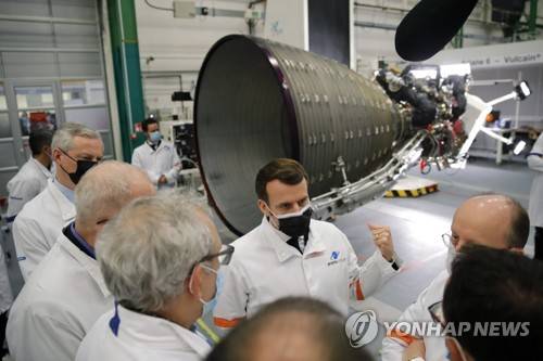 epa08932888 French President Emmanuel Macron (C, with black face mask) visits Ariane Group's industrial site in Vernon, in Normandy, France, which is specialized in rocket propulsion, 12 January 2021. The site is getting new financing to support the French and European space industry and develop clean hydrogen projects. EPA/CHRISTOPHE ENA / POOL MAXPPP OUT