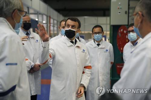 epa08932895 French President Emmanuel Macron (C, with black face mask) visits Ariane Group's industrial site in Vernon, in Normandy, France, which is specialized in rocket propulsion, 12 January 2021. The site is getting new financing to support the French and European space industry and develop clean hydrogen projects. EPA/CHRISTOPHE ENA / POOL MAXPPP OUT