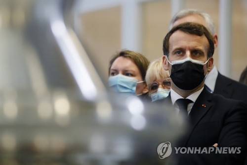 epa08932910 French President Emmanuel Macron (with black face mask) visits Ariane Group's industrial site in Vernon, in Normandy, France, which is specialized in rocket propulsion, 12 January 2021. The site is getting new financing to support the French and European space industry and develop clean hydrogen projects. EPA/CHRISTOPHE ENA / POOL MAXPPP OUT