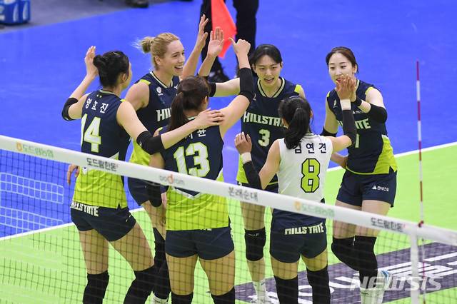 [서울=뉴시스] 박민석 기자 = 12일 경기 수원시 수원실내체육관에서 열린 도드람 2020-2021 V리그 현대건설과 기업은행의 경기, 현대건설 선수들이 환호하고 있다. (사진=현대건설 배구단 제공) photo@newsis.com