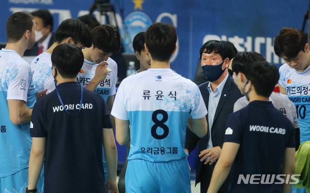 [서울=뉴시스] 박민석 기자 = 12일 인천 계양구 계양체육관에서 열린 도드람 2020-2021 V리그 우리카드와 대한항공과의 경기, 우리카드 신영철 감독이 작전 지시를 하고 있다. (사진=우리카드 배구단 제공) photo@newsis.com