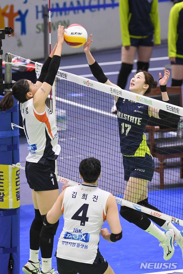[서울=뉴시스] 박민석 기자 = 12일 경기 수원시 수원실내체육관에서 열린 도드람 2020-2021 V리그 현대건설과 기업은행의 경기, 현대건설 고예림이 상대 선수와 네트 다툼을 하고 있다. (사진=현대건설 배구단 제공) photo@newsis.com