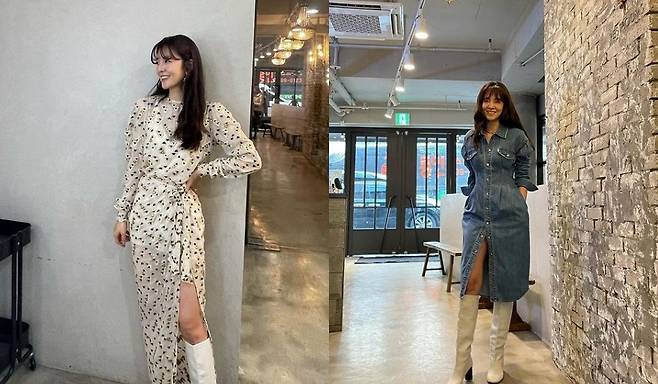 김성은은 섹시한 원피스에 롱부츠를 매치한 패션으로 모델 같은 완벽한 콜라병 몸매와 눈부신 인형 비주얼을 뽐내고 있다.