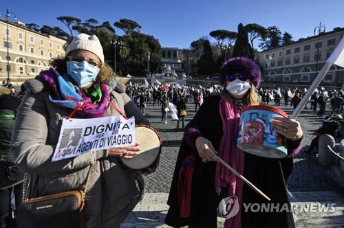 epa08932968 Protesters during the demonstration by workers of tourism sector like agencies, operators and guides at Piazza del Popolo in Rome, Italy, 12 January 2021. EPA/RICCARDO ANTIMIANI