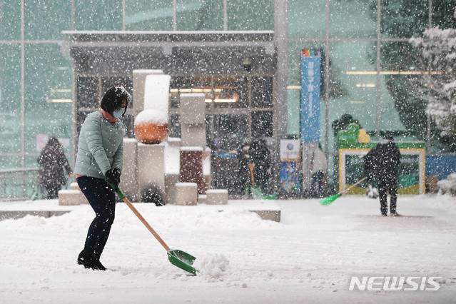 [서울=뉴시스] 박민석 기자 = 서울 지역에 눈이 내린 12일 오후 서울 성동구 성동구청에서 구청 직원들이 구청사 주변 보행로에 대한 제설 작업을 하고 있다. (사진=성동구 제공) 2021.01.12. photo@newsis.com