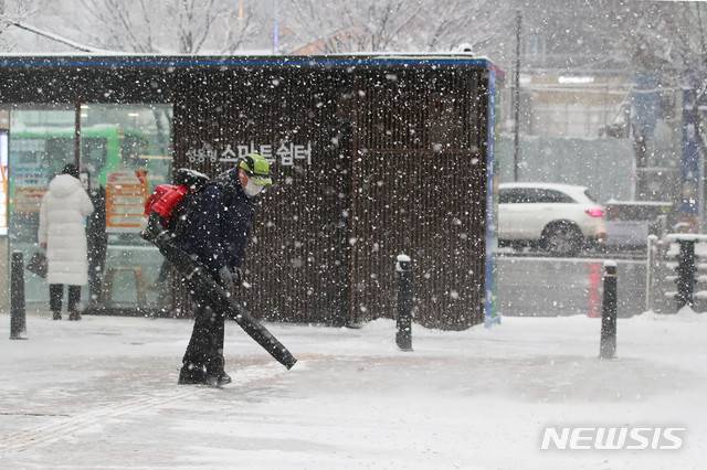 [서울=뉴시스] 박민석 기자 = 서울 지역에 눈이 내린 12일 오후 서울 성동구 성동구청에서 구청 직원들이 구청사 주변 보행로에 대한 제설 작업을 하고 있다. (사진=성동구 제공) 2021.01.12. photo@newsis.com