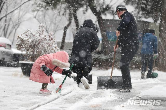 [서울=뉴시스] 박민석 기자 = 서울 지역에 눈이 내린 12일 오후 서울 성동구 성동구청에서 구청 직원들이 구청사 주변 보행로에 대한 제설 작업을 하고 있다. (사진=성동구 제공) 2021.01.12. photo@newsis.com
