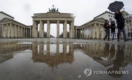 Three persons walk past a puddle in front of the Brandenburg Gate during a rainy day in Berlin, Germany, Tuesday, Jan. 12, 2021. (AP Photo/Michael Sohn)