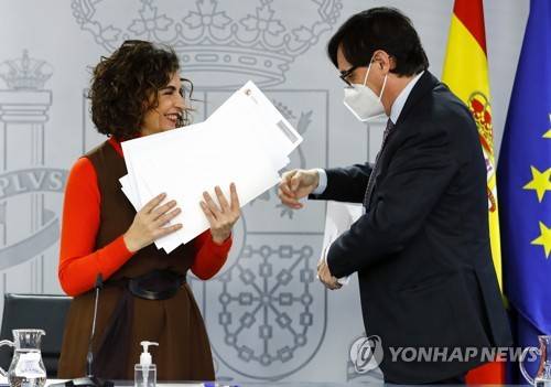 epa08933032 Treasury Minister and Government spokeswoman Maria Jesus Montero (L) next to Health minister Salvador Illa (R) at the end of the press conference after the cabinet meeting held at Moncloa Palace in Madrid, Spain, 12 January 2021. EPA/Ballesteros