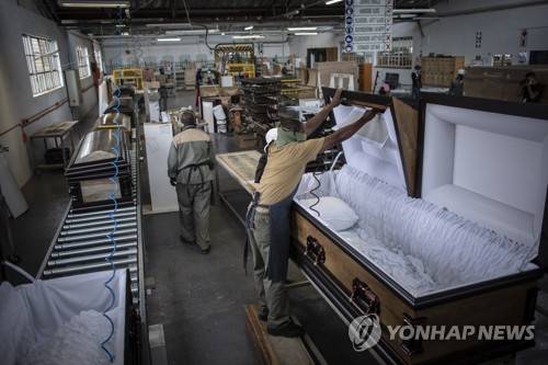 epa08933041 A worker on the production line adds the interior to one of the highend coffins at the AVBOB undertakers coffin factory in Bloemfontein, South Africa, 12 January 2021. ?AVBOB undertakers? was formed 102 years ago in the same city during the height of the worldwide 'Spanish flu' pandemic in 1918, which killed between 50 and 100 million people. South Africa is currently facing a huge increase in COVID-19 cases. It is one of the countries hit by the new strain of the virus which has a higher transmission rate. The country is struggling to cope with growing numbers of COVID-19 hospitalizations and deaths which resulted in some undertakers facing shortage in coffins. EPA/KIM LUDBROOK ATTENTION: This Image is part of a PHOTO SET