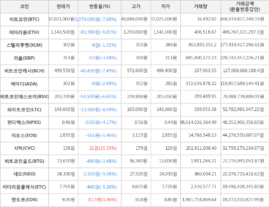 또한, 라이트코인(-8.59%, 143,600원), 비트코인캐시(-7.49%, 499,550원), 이더리움(-6.81%, 1,143,500원), 비트코인에스브이(-6.65%, 203,700원), 이오스(-5.46%, 2,855원), 이더리움클래식(-5.36%, 7,765원), 펀디엑스(-4.17%, 0.46원), 리플(-3.68%, 314원), 비트코인골드(-3.48%, 13,610원), 에이다(-2.89%, 302원), 스텔라루멘(-1.31%, 302원)이 하락세를 나타냈다.