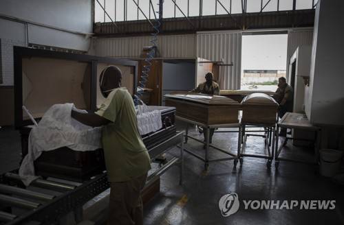 epa08933048 Workers push newly sprayed coffins from the spray booth at the AVBOB undertakers coffin factory in Bloemfontein, South Africa, 12 January 2021. ?AVBOB undertakers? was formed 102 years ago in the same city during the height of the worldwide 'Spanish flu' pandemic in 1918, which killed between 50 and 100 million people. South Africa is currently facing a huge increase in COVID-19 cases. It is one of the countries hit by the new strain of the virus which has a higher transmission rate. The country is struggling to cope with growing numbers of COVID-19 hospitalizations and deaths which resulted in some undertakers facing shortage in coffins. EPA/KIM LUDBROOK ATTENTION: This Image is part of a PHOTO SET