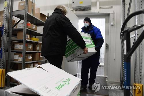 epa08933056 Two men carry a box from the first batch of the COVID-19 vaccine manufactured by US biotechnology company Moderna at the premises of Hungarian pharmaceuticals wholesaler Hungaropharma in Budapest, Hungary, 12 January 2021. The vaccine will be stored in a freezer at minus 25 degrees Celsius. HUNGARY OUT HANDOUT EDITORIAL USE ONLY/NO SALES