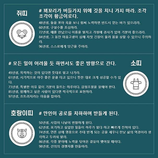범띠 # 만인이 공로를 치하하며 받들게 된다. 50년생, 사업이 나날이 번창하게 된다. 62년생, 포기하고 싶었던 일들이 하루가 멀다 하고 빠르게 진척이 있다. 74년생, 언론 상에 영웅으로 추대 받게 되는 공을 세우니 한낮 삶의 역경이라 생각하고 두려워 말라. 86년생, 각종 분야에 노력을 닦아온 결실이 맺어질 때이다. 98년생, 선의의 경쟁자를 만들어라.