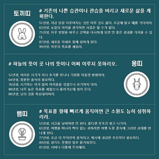 토끼띠 # 기존의 나쁜 습관이나 관습을 버리고 새로운 삶을 계획한다. 51년생, 지금 당장 이루어지는 것은 아무 것도 없다. 조급해 말고 때를 기다려라. 63년생, 눈앞의 이익을 생각하면 사업은 할 수가 없다. 75년생, 자꾸 방향을 바꾸고 선택을 다시하게 되면 안 좋은 결과를 가져올 수 있다. 87년생, 새로운 자세로 일에 임하게 된다. 99년생, 하루의 목표를 세워라.