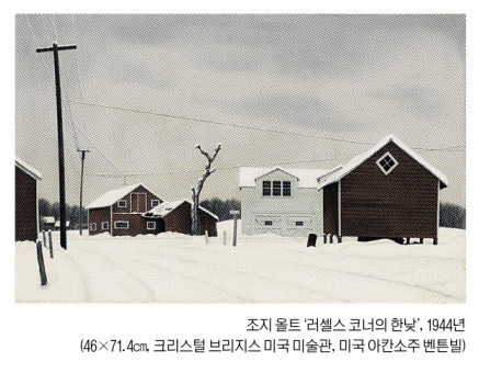 올트의 그림은 적막하고 간결하다. 이 그림은 그가 생의 마지막 10년을 보낸 뉴욕주 우드스톡의 풍경이다. 겨울 한낮 마을 외곽 교차로에는 자동차가 지나간 흔적이 있을 뿐 사람은 없다. 붉은 집과 창고가 띄엄띄엄 서 있고, 그 위를 지나는 전깃줄이 희끄무레한 하늘을 가른다. 기하학적인 직선들 가운데 말라 죽은 나무 한 그루가 유일하게 곡선을 그리고 있다. 외롭지만 외롭다고 소리 내어 말하지 않는 그림.