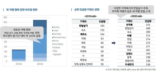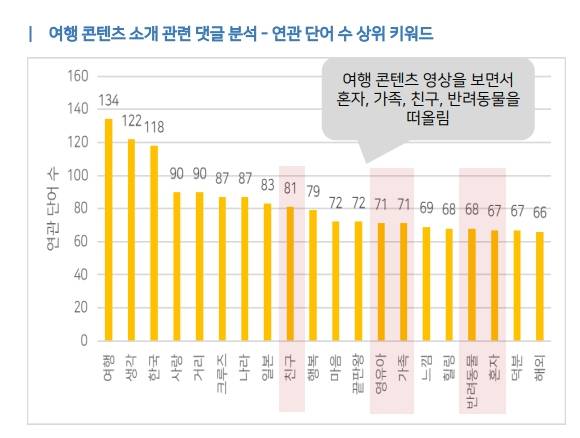 이번 분석을 통해 코로나로 인한 불안감이 ‘치유형 여행’, ‘근교중심 여행’, ‘유명 관광지 이외 새로운 목적지로의 여행’, ‘소수 여행 동반자와 유대강화’ 등 심리적·물리적 안정을 추구하는 여행 흐름을 이끌어냈음을 알 수 있었다. 동시에 코로나 회복에 대한 기대감이 ‘새롭고 독특한 여행 콘텐츠’에 대한 관심을 유도하고 있는 것으로 파악됐다.