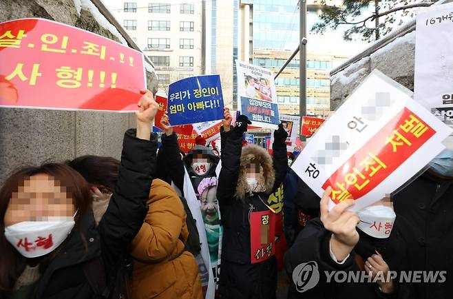 (서울=연합뉴스) 홍해인 기자 = 16개월 된 입양 딸 정인양을 학대해 숨지게 한 혐의를 받는 양부모에 대한 첫 공판이 열린 13일 서울 양천구 남부지방법원 앞에서 시민들이 시위를 벌이고 있다. 2021.1.13