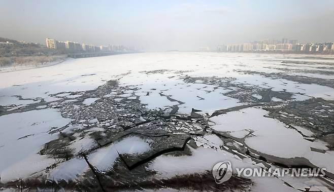 (서울=연합뉴스) 김인철 기자 = 13일 오전 서울 동작대교 인근 결빙된 한강 위로 전날 내린 눈이 쌓여있다. 2021.1.13