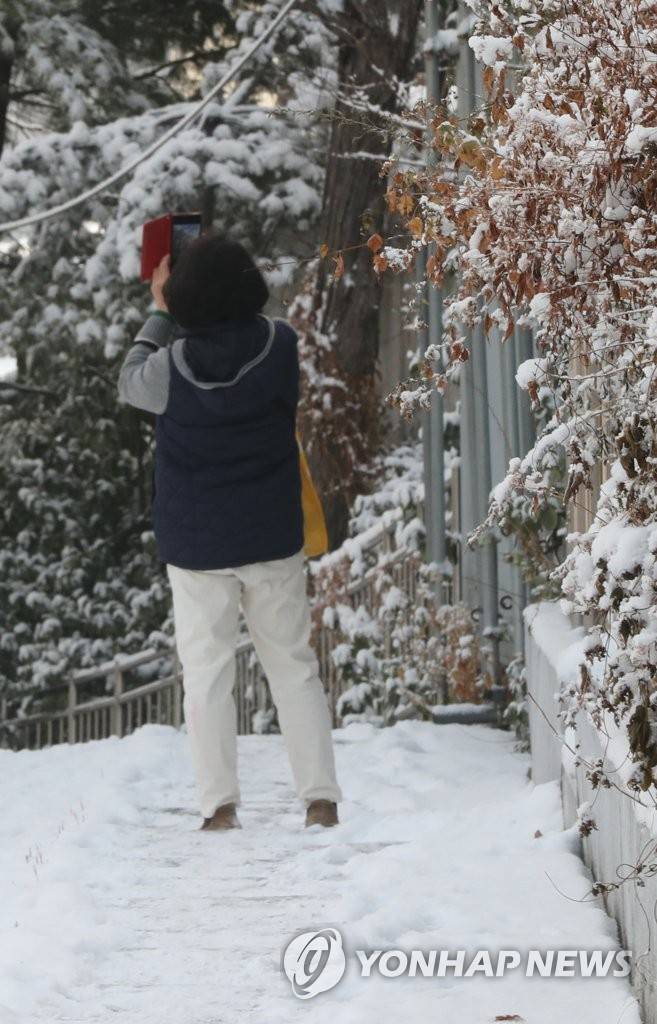 (서울=연합뉴스) 백승렬 기자 = 13일 오전 서울시 종로구 사직터널 인근 인도에서 한 시민이 출근길에 휴대전화로 풍경을 촬영하고 있다. 2021.1.13