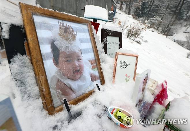 (양평=연합뉴스) 서명곤 기자 = 13일 오전 경기도 양평군 하이패밀리 안데르센 공원묘원에 양부모의 학대로 생후 16개월 만에 숨진 정인 양의 사진이 놓여있다.