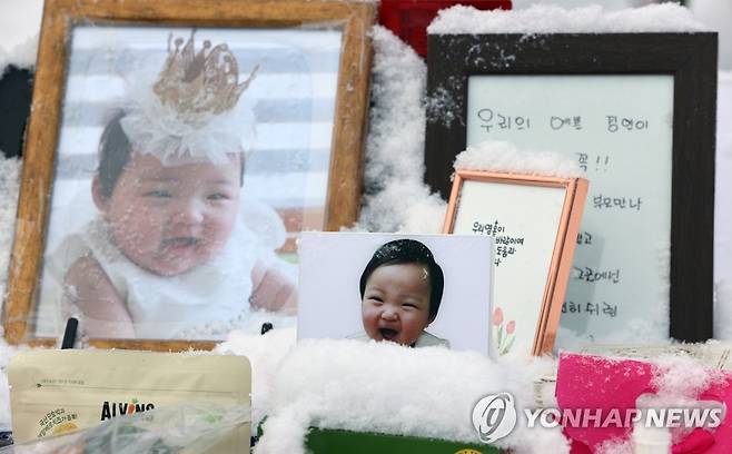 (양평=연합뉴스) 서명곤 기자 = 13일 오전 경기도 양평군 하이패밀리 안데르센 공원묘원에 양부모의 학대로 생후 16개월 만에 숨진 정인 양의 사진이 놓여있다.