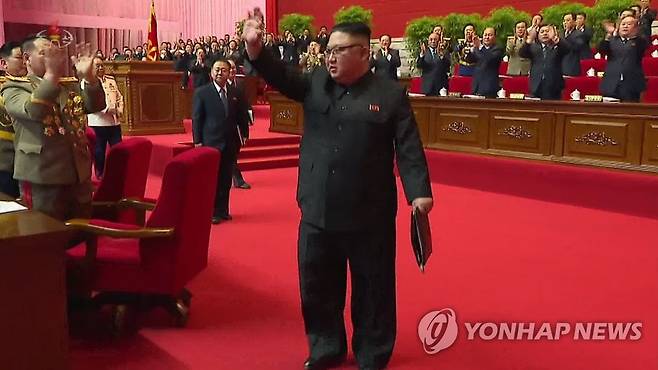 (서울=연합뉴스) 북한 조선중앙TV는 지난 12일 평양에서 노동당 제8차 대회가 폐막했다고 13일 보도했다. 김정은 당 총비서가 박수를 받으며 당대회 참석자들에게 손을 흔들고 있다. [조선중앙TV 화면] 2021.1.13