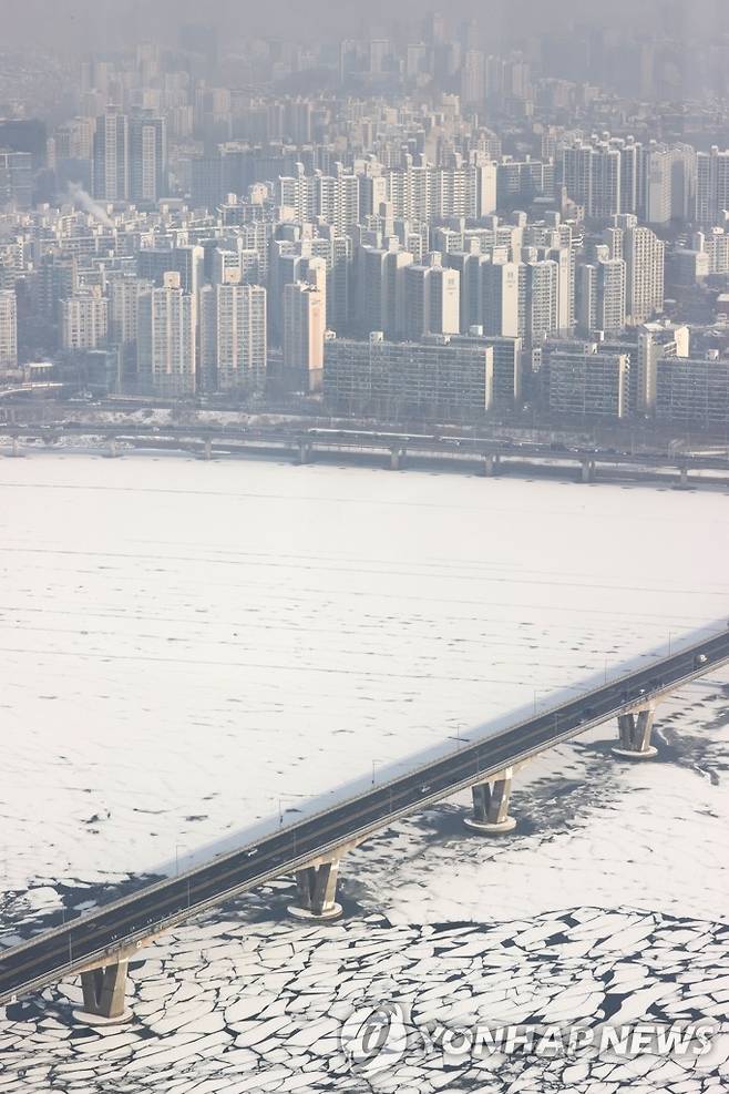 (서울=연합뉴스) 김인철 기자 = 13일 오전 서울 원효대교 인근 결빙된 한강 위로 전날 내린 눈이 쌓여있다. 2021.1.13