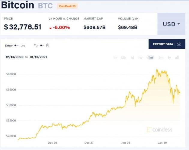 비트코인 가격은 작년 하반기 폭등세를 지속하면서 지난 9일엔 4만2000만달러에 육박할 정도로 올랐다. 하지만 이번 주 들어 급락해 지난 12일 3만달러 선까지 떨어졌으며, 13일 오전 10시 현재 3만2000달러대에 머물고 있다.