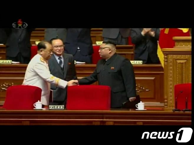북한, 당 대회 폐막..리병철과 악수하는 김정은