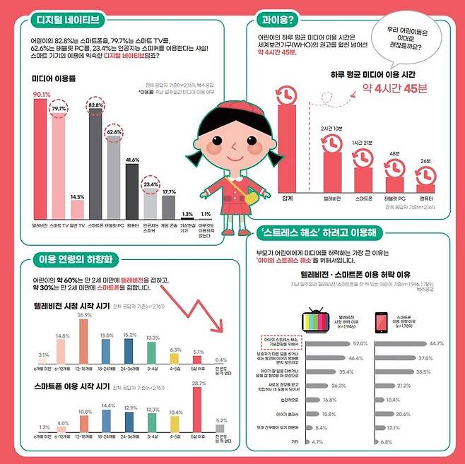 우리나라 만 3∼9세 어린이는 하루 평균 4시간45분 동안 미디어를 이용하는 것으로 조사됐다.