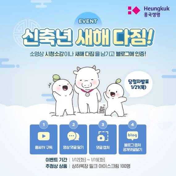 흥국생명은 이번 이벤트와 함께 애니메이션 '흥국더쥬'의 '우직하고 부지런한 소'편을 공개했다. 이번 영상에는 소의 우직함을 흥국생명과 연결해 고객의 행복을 위해 우직하게 나아가겠다는 새해 다짐을 담았다. '흥국더쥬'는 인기 웹툰인 '러브둥둥'과 합작한 흥국생명만의 애니메이션 웹툰이다. 이벤트 참여는 '흥싸TV' 유튜브 채널을 구독한 뒤 시청 소감이나 새해 다짐을 남기고 이를 캡처해 공식 블로그에 댓글로 남기면 된다. 신축년 새해 다짐 이벤트는 오는 19일까지 진행되며, 이벤트 참여자 중 추첨을 통해 100명에게 아이스크림 기프티콘을 제공할 예정이다. 당첨자는 오는 21일에 발표된다.