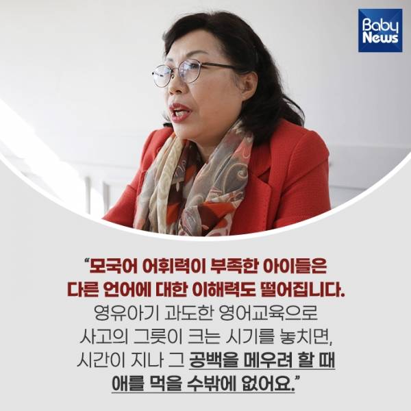 "모국어 어휘력이 부족한 아이들은 다른 언어에 대한 이해력도 떨어집니다. 영유아기 과도한 영어교육으로 사고의 그릇이 크는 시기를 놓치면, 시간이 지나 그 공백을 메우려 할 때 애를 먹을 수밖에 없어요."