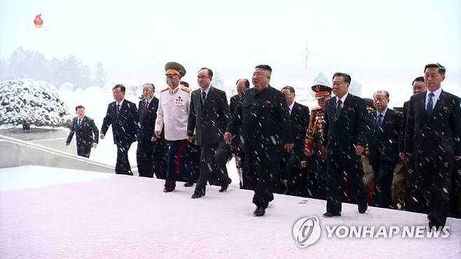 (서울=연합뉴스) 조선중앙TV는 12일 김정은 당 총비서와 8차 당대회에서 새로 선출된 당 중앙지도기관 간부들이 평양 금수산태양궁전을 찾아 참배했다고 13일 보도했다. 사진은 폭설 속에 금수산태양궁전으로 들어서는 김 총비서와 리병철 당 중앙군사위원회 부위원장(앞줄 맨 왼쪽부터), 조용원 당 비서, 최룡해 최고인민회의 상임위원장, 김덕훈 내각총리. [조선중앙TV 화면] 2021.1.13