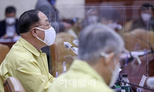 [이데일리 김태형 기자] 홍남기 경제부총리 겸 기획재정부 장관이 13일 오전 서울 종로구 정부서울청사에서 열린 '비상경제 중앙대책본부회의 겸 한국판뉴딜 관계장관회의'에 참석해 모두발언을 하고 있다.