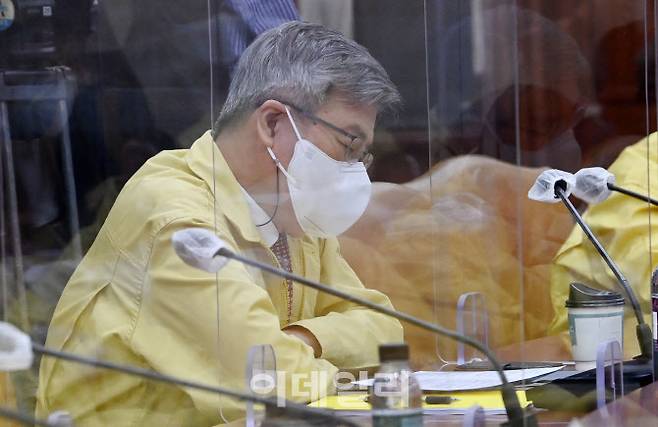 [이데일리 김태형 기자] 이재갑 고용노동부 장관이 13일 오전 서울 종로구 정부서울청사에서 열린 '비상경제 중앙대책본부회의 겸 한국판뉴딜 관계장관회의'에 참석해 홍남기 경제부총리의 모두발언을 듣고 있다.