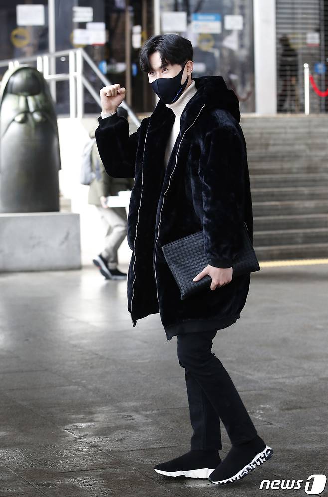 (서울=뉴스1) 권현진 기자 = 가수 신성이 13일 서울 여의도 KBS에서 열린 방송 녹화를 위해 출근을 하며 파이팅을 외치고 있다. 2021.1.13/뉴스1