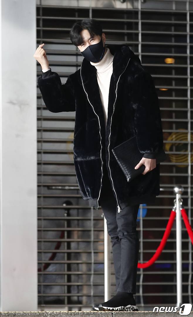 (서울=뉴스1) 권현진 기자 = 가수 신성이 13일 서울 여의도 KBS에서 열린 방송 녹화를 위해 출근을 하며 하트를 그리고 있다. 2021.1.13/뉴스1