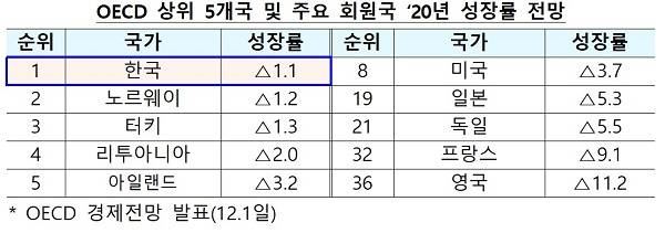 실제로 경제협력개발기구(OECD)는 지난해 12월 1일 경제전망 보고서를 통해 2020년 한국의 경제성장률이 회원국 가운데 1위, 주요 20개국(G20) 중에서는 2위를 기록할 것으로 전망했다.