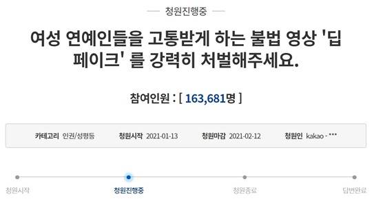 지난 12일 청와대 국민청원 게시판에는 ‘여성 연예인들을 고통 받게 하는 불법 영상 '딥페이크'를 강력히 처벌해주세요’라는 제목의 청원이 올라왔다. 이 청원은 13일 오전 10시 45분 현재 16만 3000여 명의 동의를 얻어 이날 중 20만 동의가 예상된다.