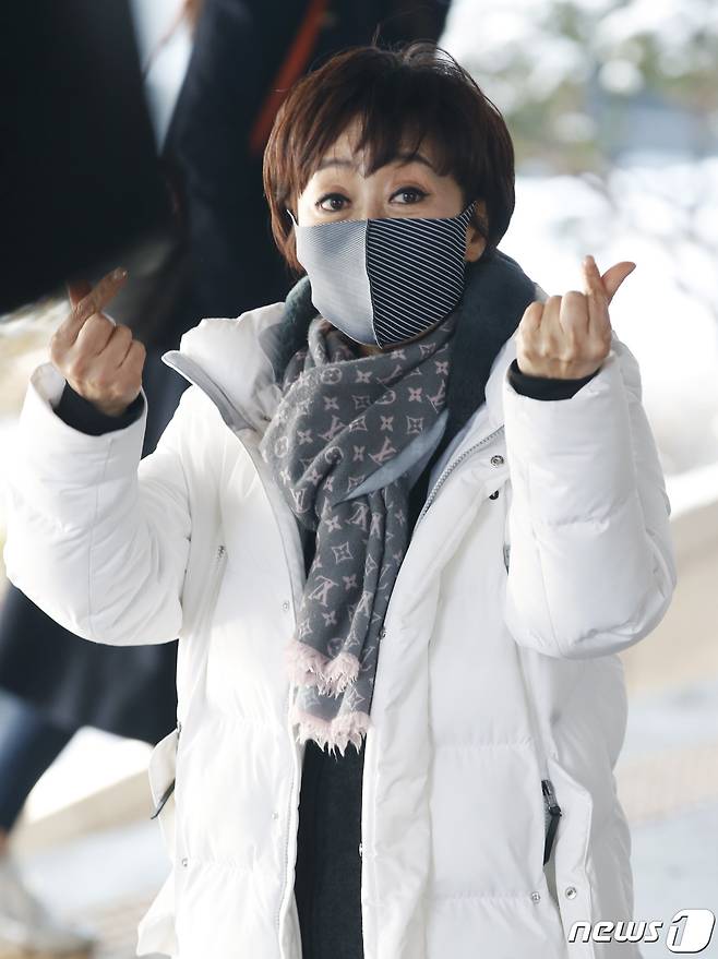 (서울=뉴스1) 권현진 기자 = 가수 하춘화가 13일 서울 여의도 KBS에서 열린 방송 녹화를 마치고 퇴근을 하며 하트를 그리고 있다. 2021.1.13/뉴스1
